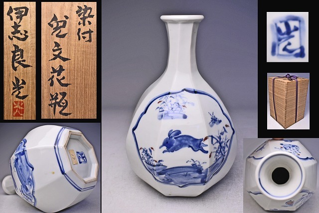 > 伊志良光 ★ 染付兎文花瓶 ★ 共箱 ★ 李朝風 ★ 面取 ★ 人間国宝 藤本能道 浅野陽 薫陶 ★ 呉須 釉裏紅 辰砂 ★ 花入 ★