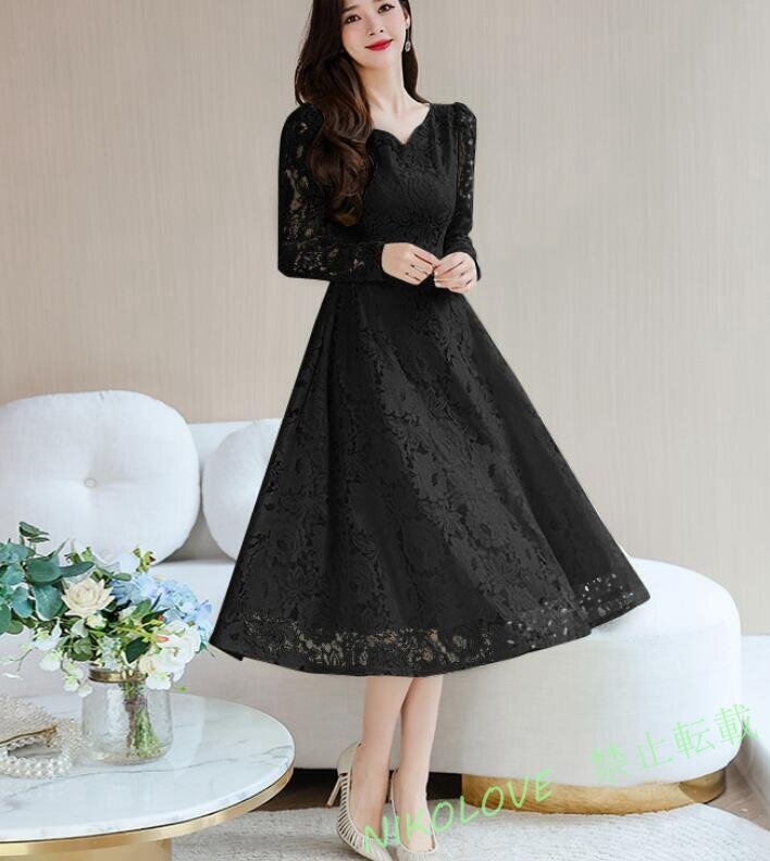- 新品上質 ふんわりワンピース ロング丈 総レース パーティー 二次会 二次会 大人 レース 長袖 ロングワンピースドレスブラック LD616