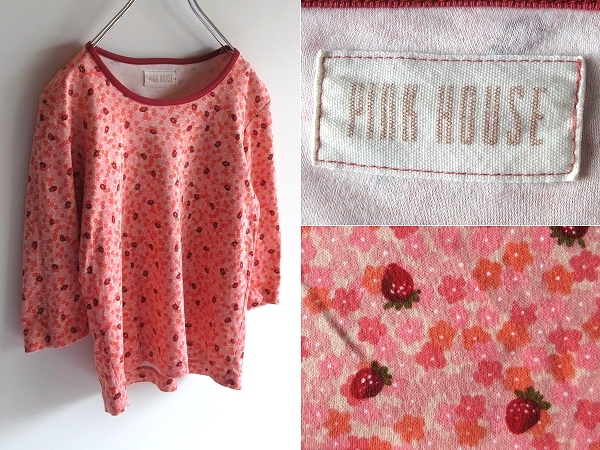 - ネコポス対応 PINK HOUSE ピンクハウス 苺/イチゴ 小花柄/フラワー柄 プリント Tシャツ 七分袖 カットソー M カネコイサオ KANEKO ISAO