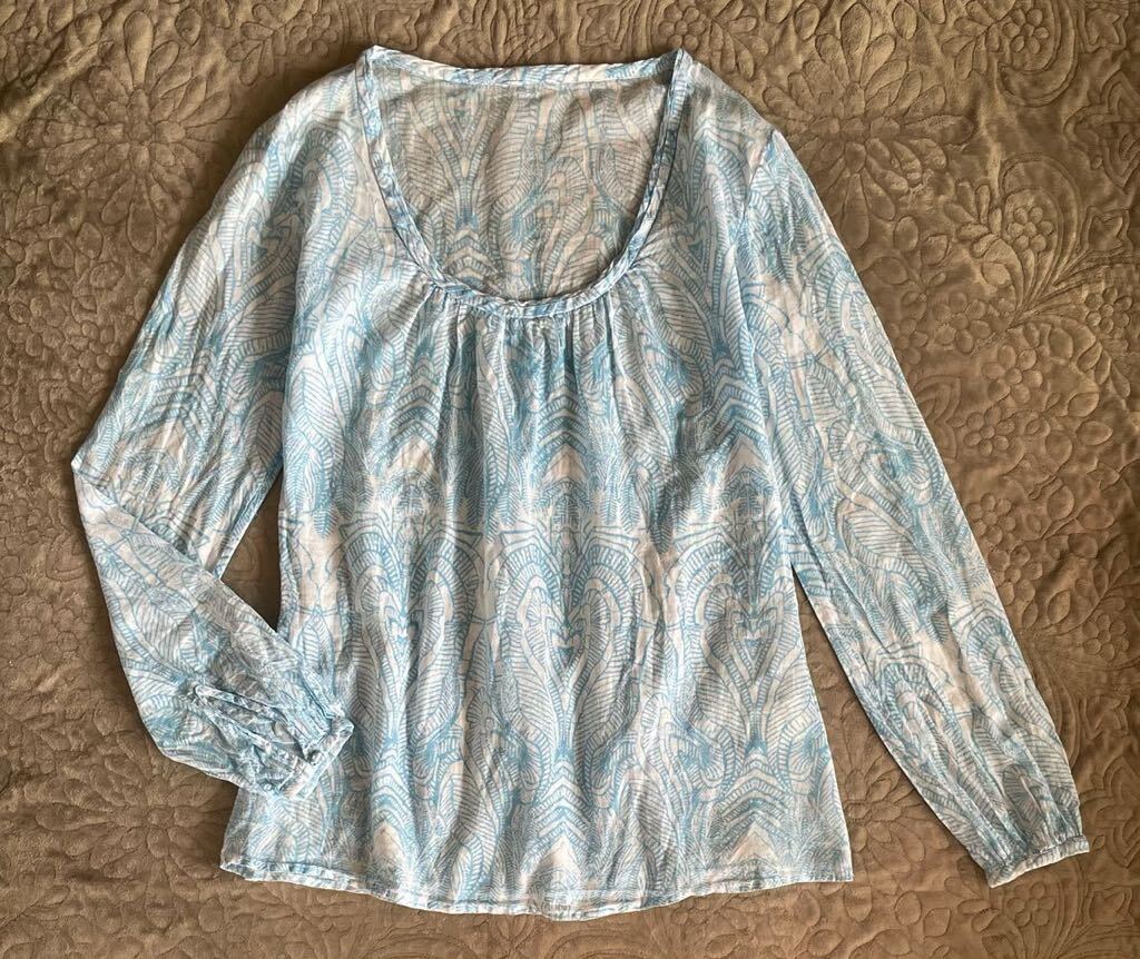 > CLOSEDカットソー Uネック ギャザー水色 白 くるみボタン 虫 ボタニカル風 長袖 綿100% コットン クローズド ストックマン S