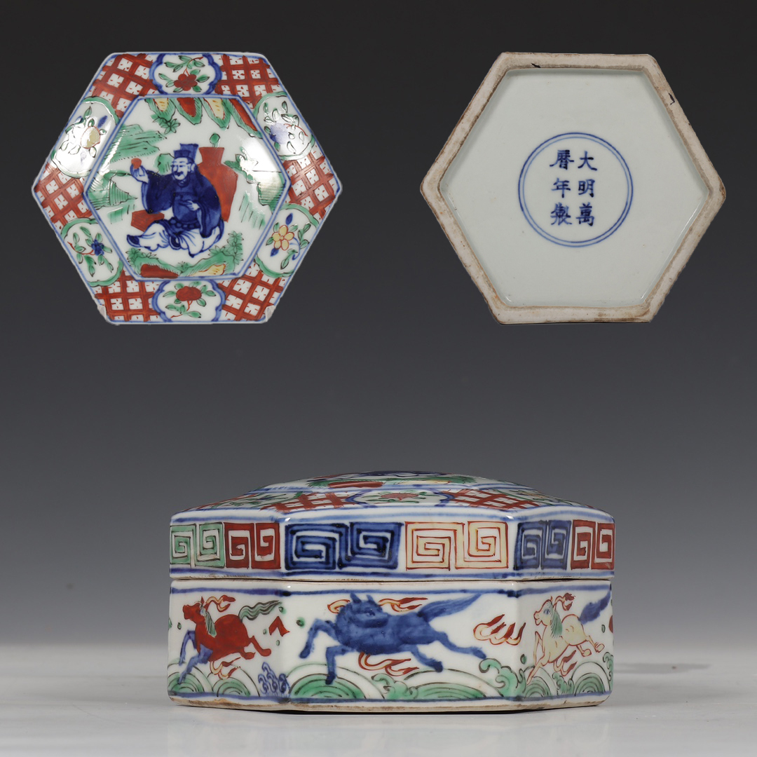 - 旧藏 大明万歴年製款 五彩人物六方粉盒 盒子 唐物 箱付き 陶磁器 中国美術 置物 賞物 RG93