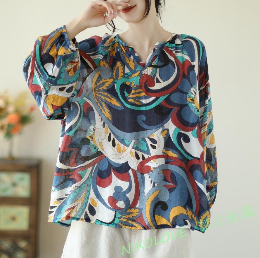 - 新品夏チュニック ブラウス 長袖 レディース プリント柄 Vネック シャツ 涼しい 薄い 大きいサイズ ゆったり 花柄 大人 トップスLG763