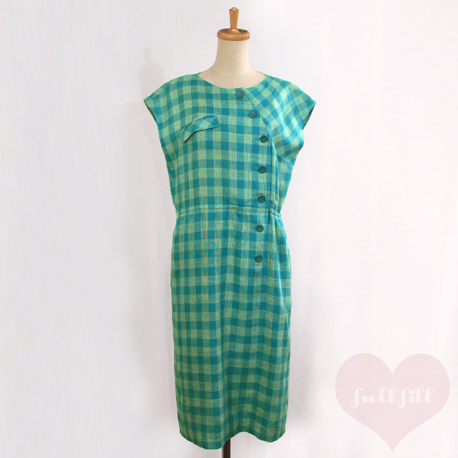 > ワンピース 古着 昭和レトロ チェック柄 グリーン ビンテージ ヴィンテージ vintage 70s 80s 麻混 タイト レディース古着 衣装 フェミニン