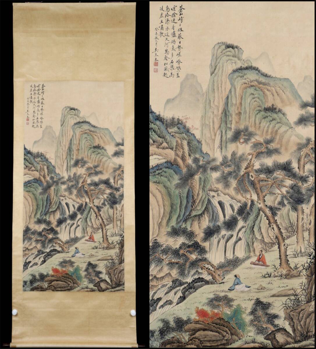 - 古美術 掛け軸 中国・近現代 「呉琴木書」 紙本 【飛瀑撫琴図】 立軸 書道 巻き物 真筆逸品 肉筆保証 唐物 古画 LT-24891