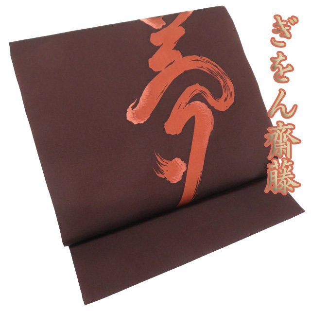 - 名古屋帯 なごや帯 中古 リサイクル 正絹 カジュアル 仕立て上がり ぎをん齋藤 刺繍 文字 夢 焦茶色 赤茶色 きもの北條 A1065-11