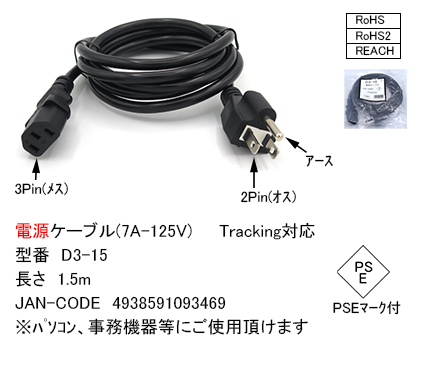 【D3-15】ATX電源用ACケーブル 3P-3P 1.5m メール便対応商品 [M16]