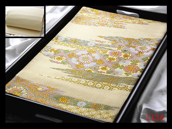 - I134厳選西陣 錦織 振袖可 唐草花紋 金色地 両面六通正絹純金糸高級美術袋帯 新品同様 ◇検◇簪着物名古屋帯帯締め