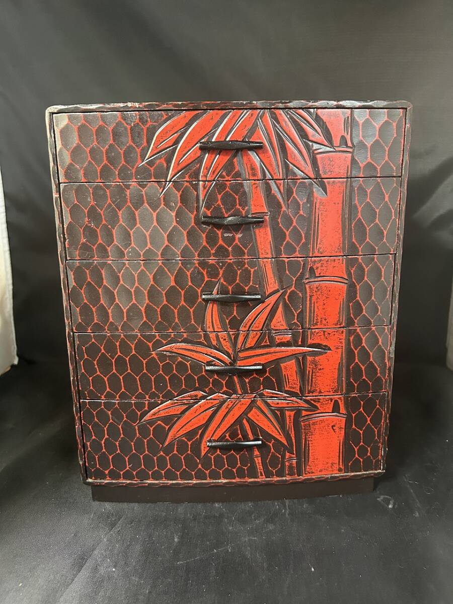 - D 410 伝統工芸 工芸美術 鎌倉彫 KAMAKURA 小引き出し 小物入 小箪笥*五杯 五段引出 中古
