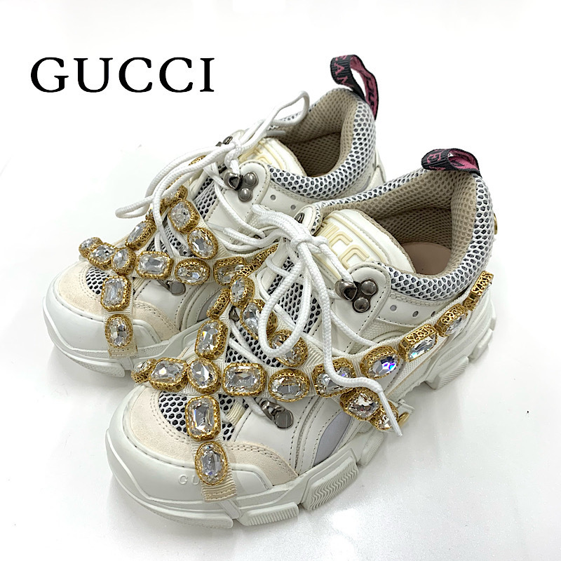 - M10359 グッチ フラッシュトレック レザー ロゴ ビジュー ストラップ スニーカー ホワイト