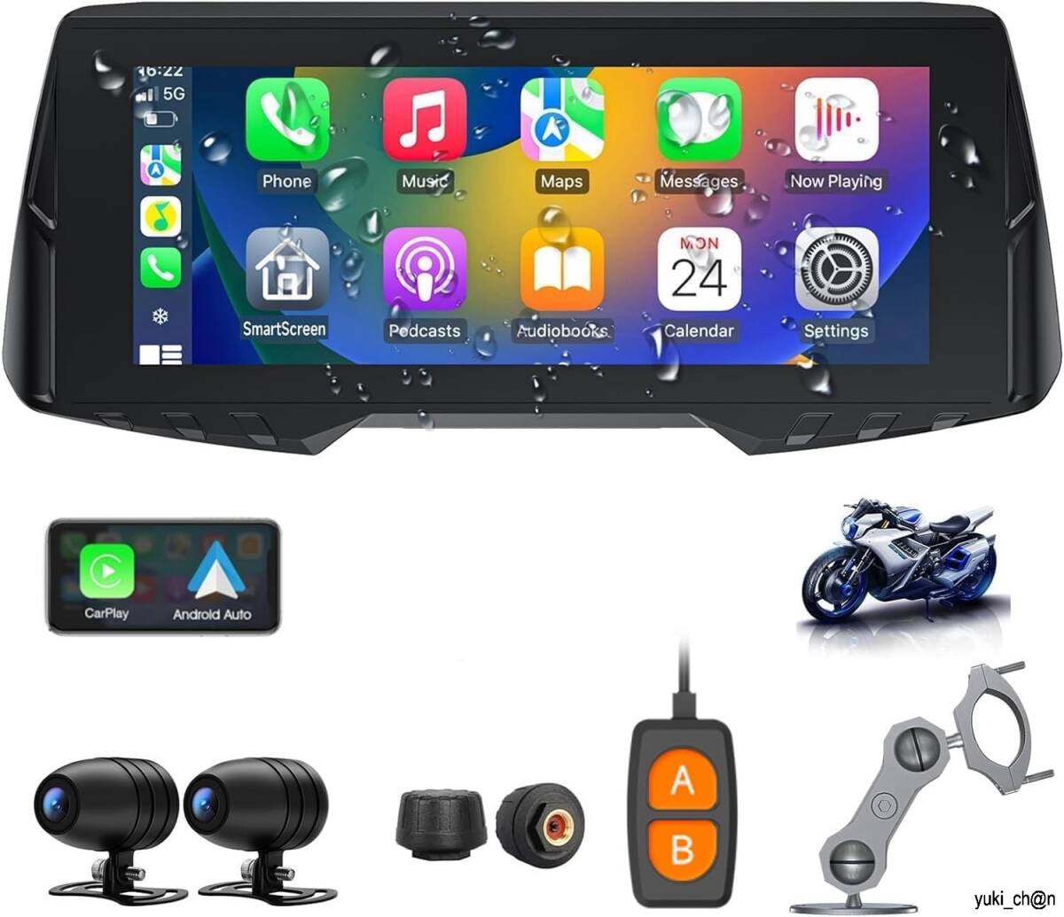 - バイクドライブレコーダー CarPlay Android Auto対応 6.86インチ液晶 デュアルBluetooth搭載 空気圧センサー付き