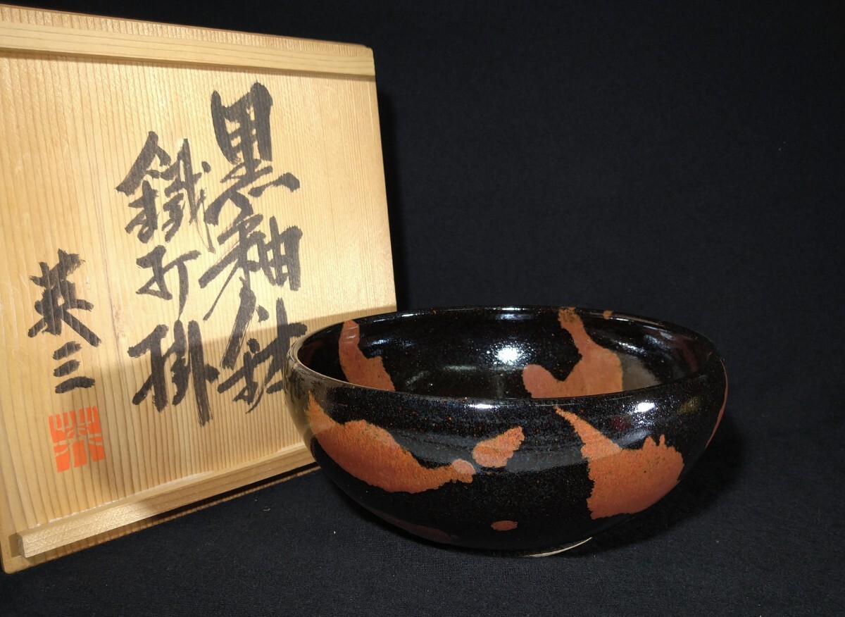 - 椋木英三 「鉄打掛黒釉鉢」 黒釉 鉄打掛け 22cm 菓子鉢 共箱 菓子器 茶道具 師:河井寛次郎 bci-59(60)b3705