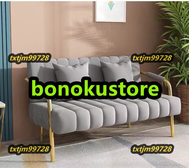 > アイアンソファ、鉄フレームソファ、二人かけソファ、ファブリックソファ、クッション2個付き