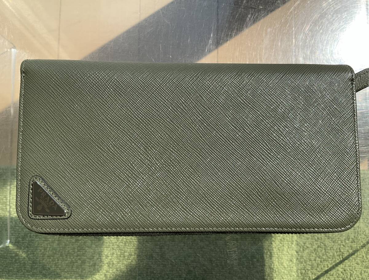 - 完品の類 送料無料 PRADA プラダ サフィアーノ レザー トライアングル ラウンドファスナー長財布 2ML317 グリーン 箱付き メンズ