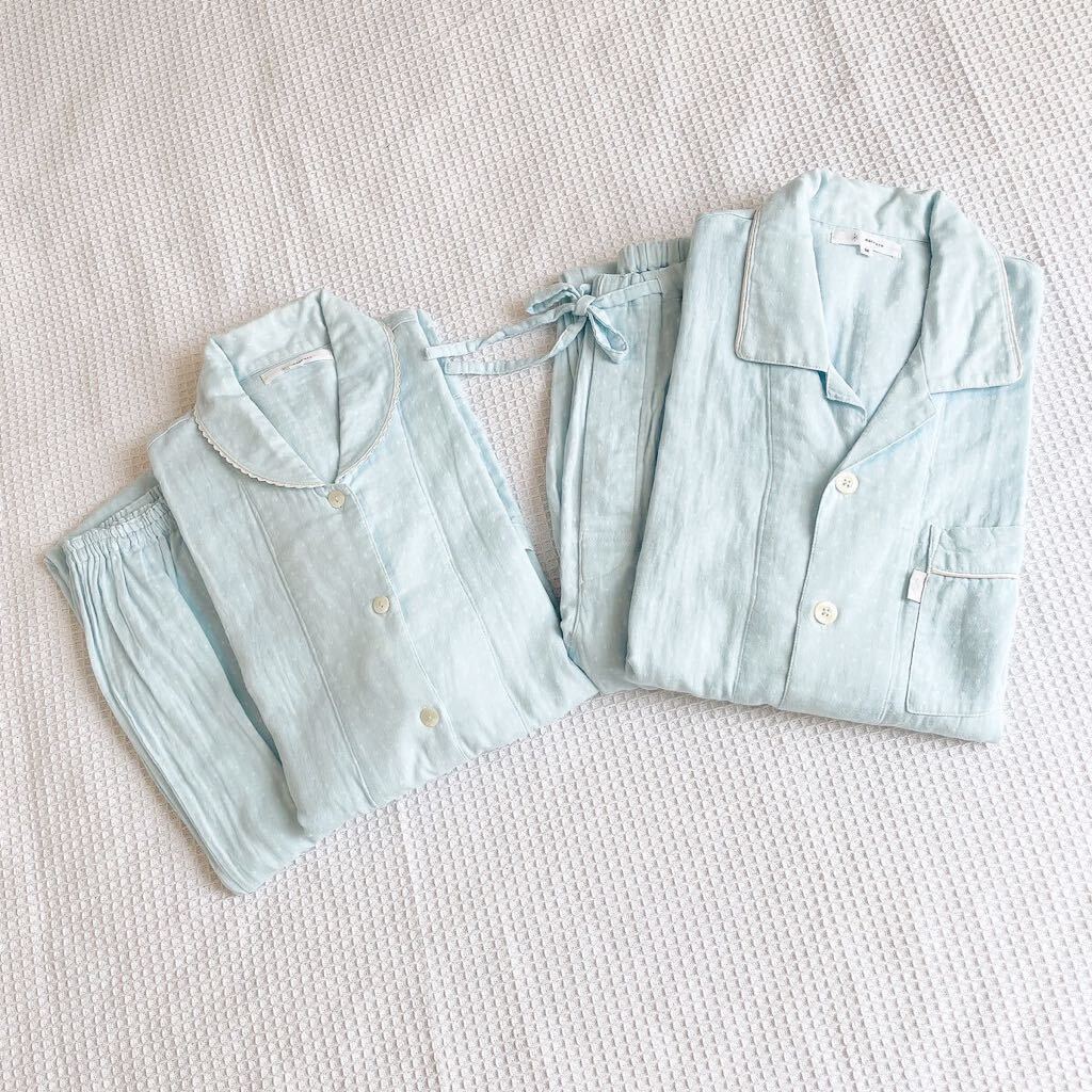 - ナクリュールnacrureガーゼ 婦人ペアパジャマ紳士メンズ水色ドット白ホワイト ルームウェア レディース水玉ブルーMサイズ ナイトウェア2組