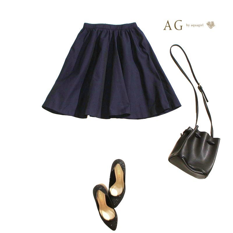- 美品 aquagirl アクアガール 株) ワールド 合物 お洒落 うっすら艶 ボリュームフレアスカート Aライン ギャザー フレア 7号 36 ネイビー 紺