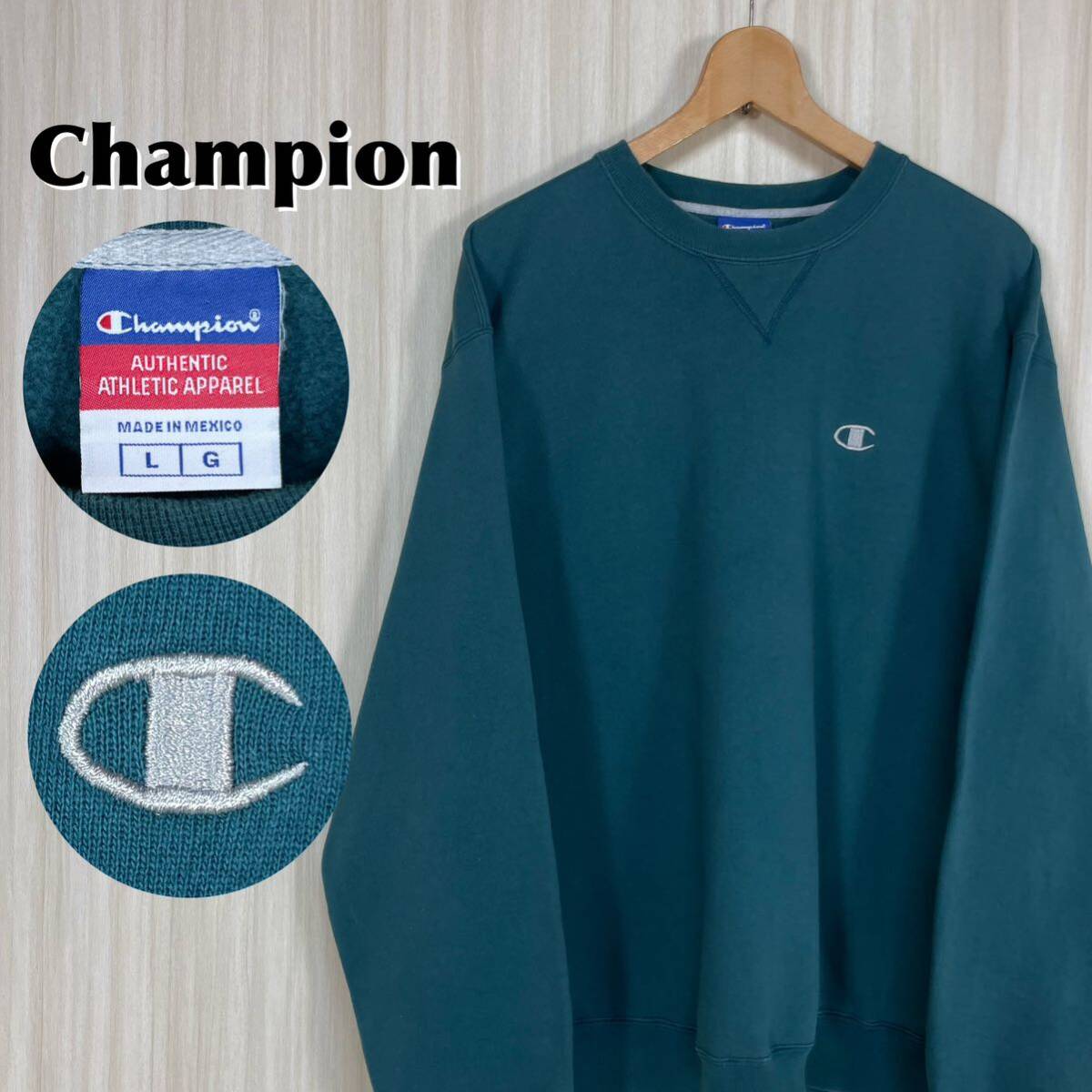 - ☆入手困難☆メキシコ製☆チャンピオン ワンポイント 刺繍ロゴ Vガゼット 裏起毛 スウェット エメラルドグリーン L表記 アメカジ 90s 古着