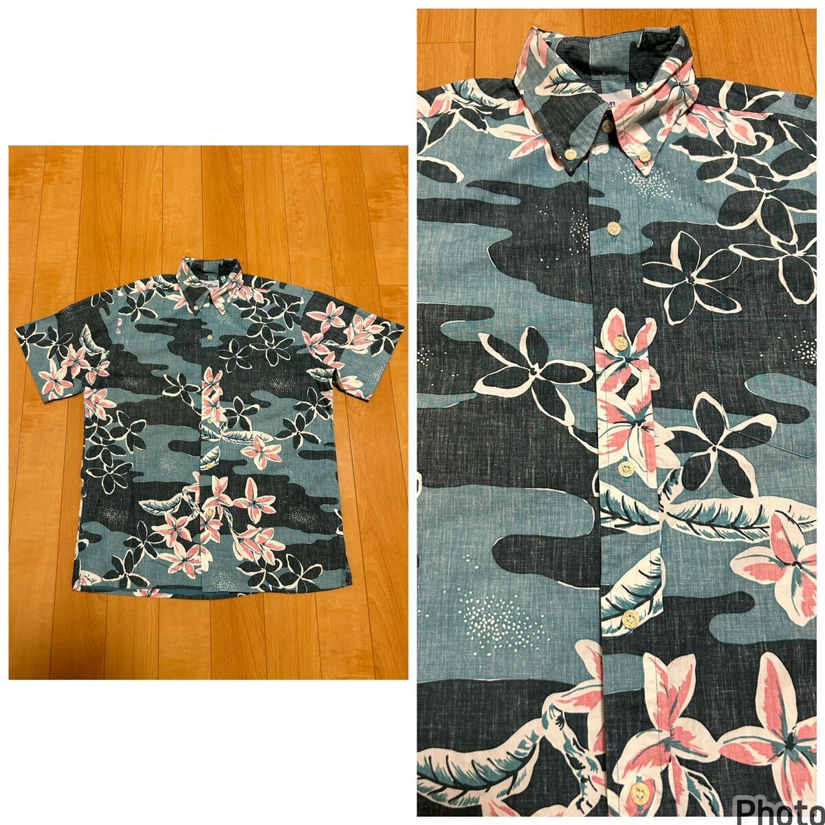 - 美品☆90s レインスプーナー サイズS大き目.日本L並 半袖オリジナルビンテージBDアロハシャツ/裏使い.ビキニタグ 全面.縞模様風 花&葉総柄