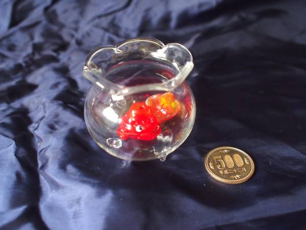 - ● 透明ガラスの金魚鉢、3点足付、ブッチョズラな赤い金魚 - 送料込み