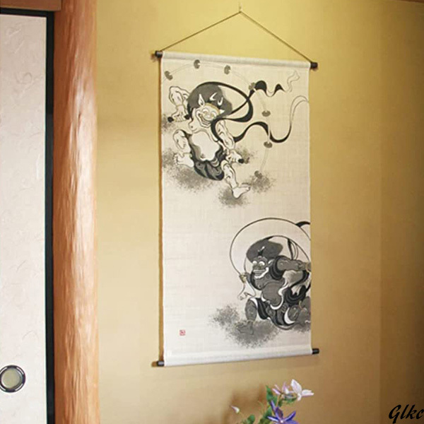 - タペストリー 風神雷神 麻生地 タペストリー 掛け軸 インテリア ディスプレイ 和モダン 壁掛け