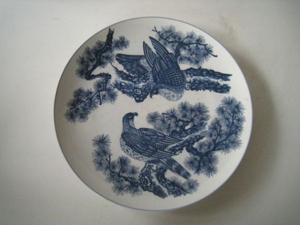 - 陶磁器の大皿 鷹の図案 飾り皿 盛り皿 ディスプレイ 絵皿 外径42×H5㎝/24N9.5-22