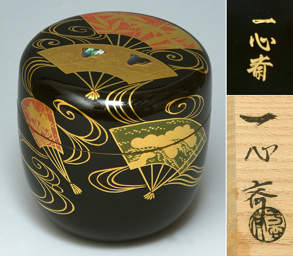 - 蒔絵師 奥津一心斉 /一心斎(作)扇流蒔絵 乾漆黒大棗 共箱 螺鈿 青貝 茶道具 木工芸 漆工芸 漆芸 未使用 z8234o