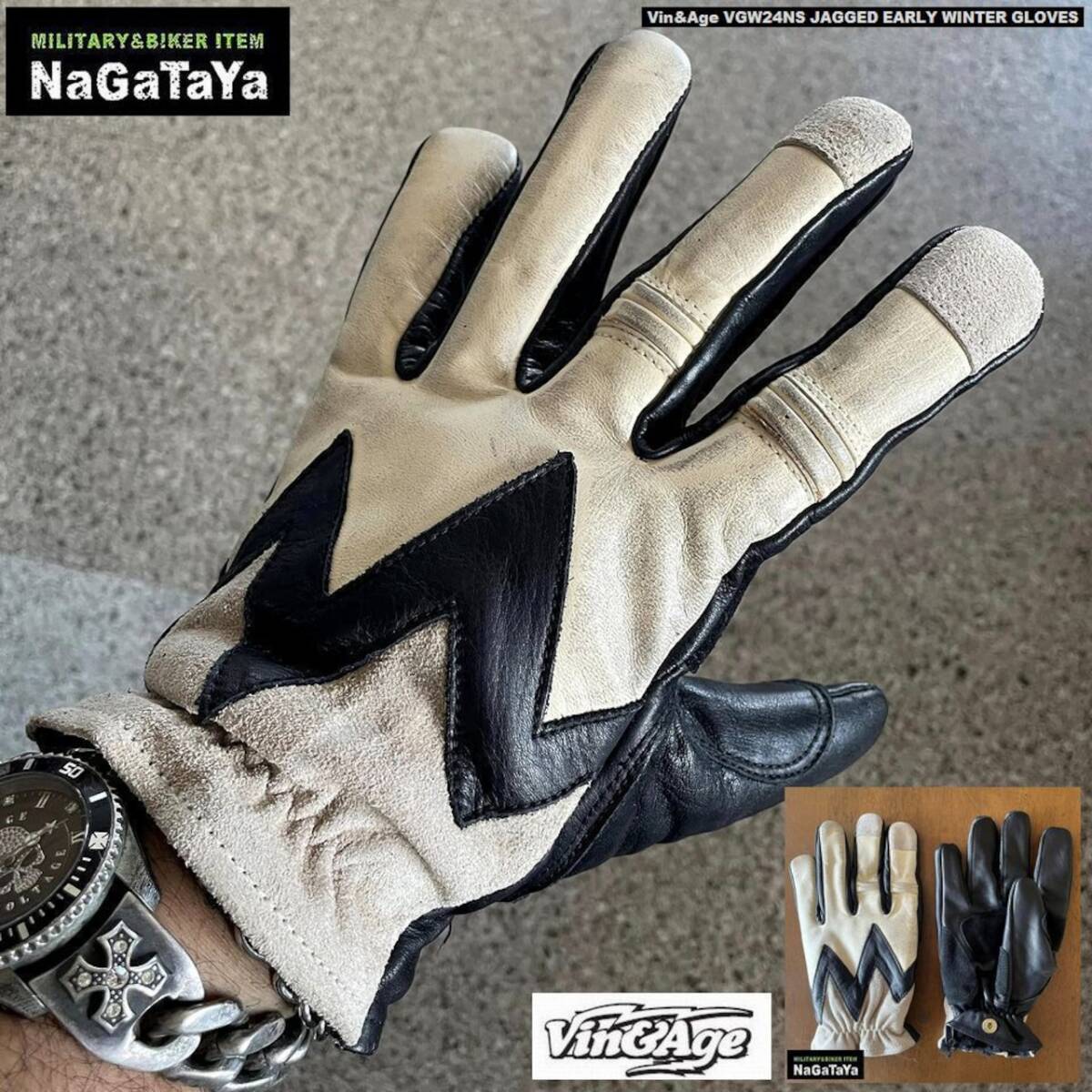 - Vin&Age VG24NS ジャジッドデザイン アーリーウインター対応 牛革×アクリルボア付 BIKER系 グローブ アイボリー XLサイズ 手袋