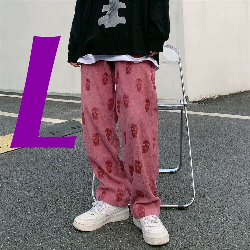 > ワイドパンツ ボトムス ストレートパンツ ドクロ柄 パンツ トレンド ストリート どくろ 個性的 インスタ メンズ レディース ピンク L