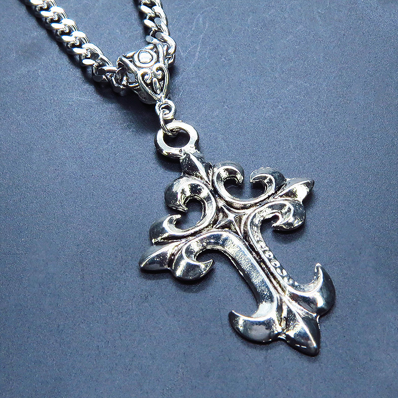 - アンティークシルバー ゴシック調デザインのカッコいいロザリオ(十字架)のペンダントネックレス ロングチェーン