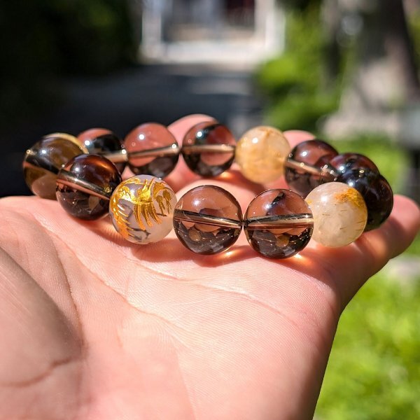 - 風水の守り神 金彫皇帝龍 ドラゴンアゲート スモーキークォーツ ゴールドルチル ブレスレット 14ミリ 開運 天然石 パワーストーン ギフト