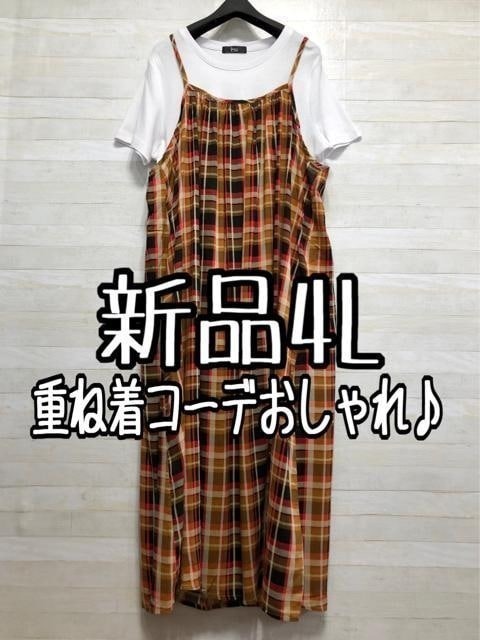 - 新品☆4L♪わけあり♪重ね着おしゃれ♪白T&チェック柄ロング丈キャミワンピ☆f431