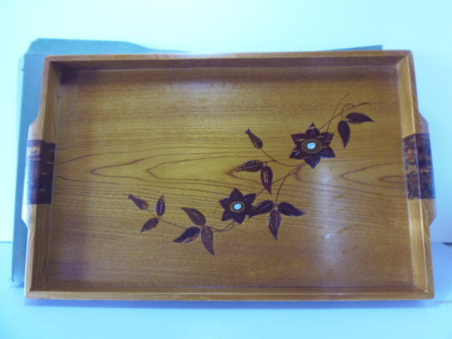 ●sk1 【盆】 木の工芸品 長手盆 角盆 天然木 貝入 鉄仙文様 ※難有(盆裏ガサガサ・凹み傷・白い曇り汚れ有)