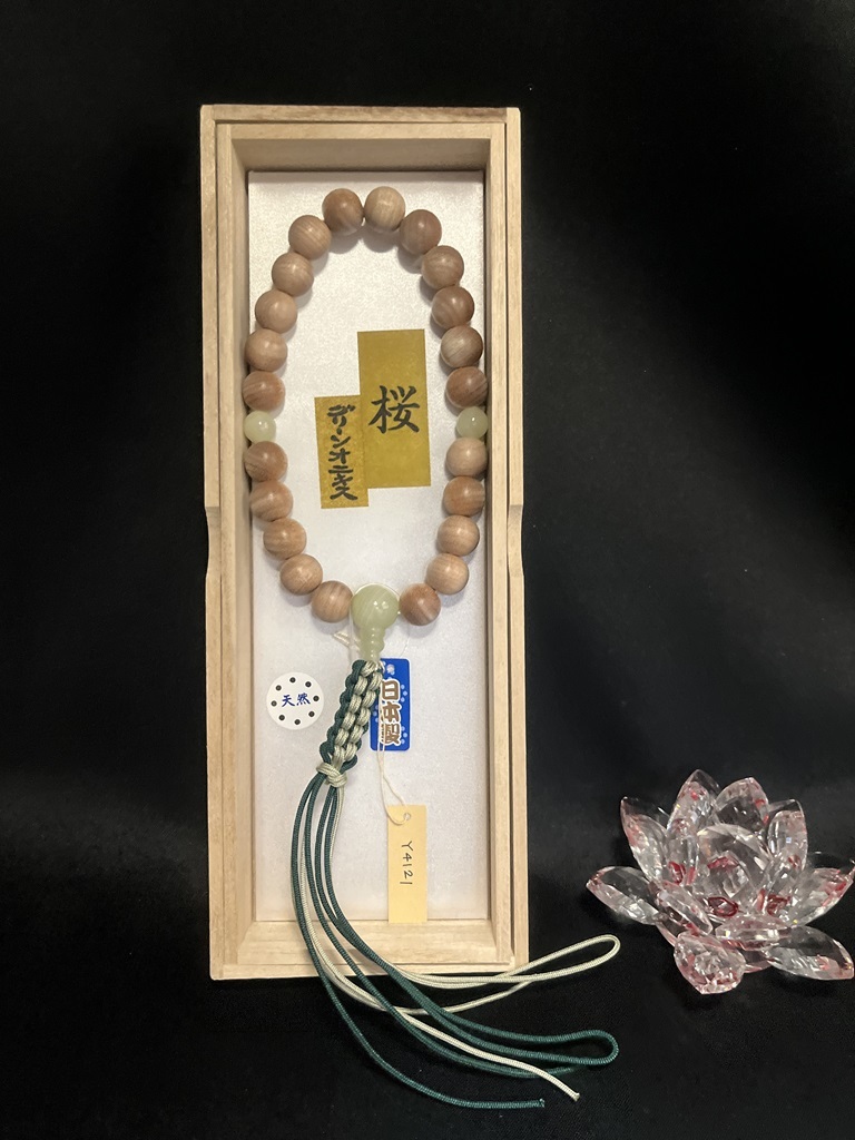 - 川本仏壇店/念珠「和桜/グリーンオニキス仕立/22玉/正絹紐房/山田念珠堂/天然木/川本仏