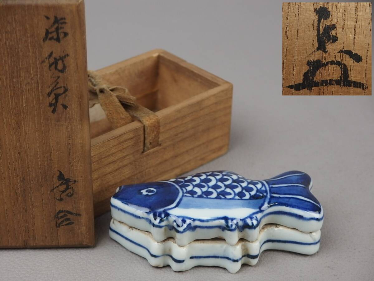 - 【骨董・茶道具】★中国古玩 吸江斎書付★★古染付魚形香合 fp075sgl.8 古渡