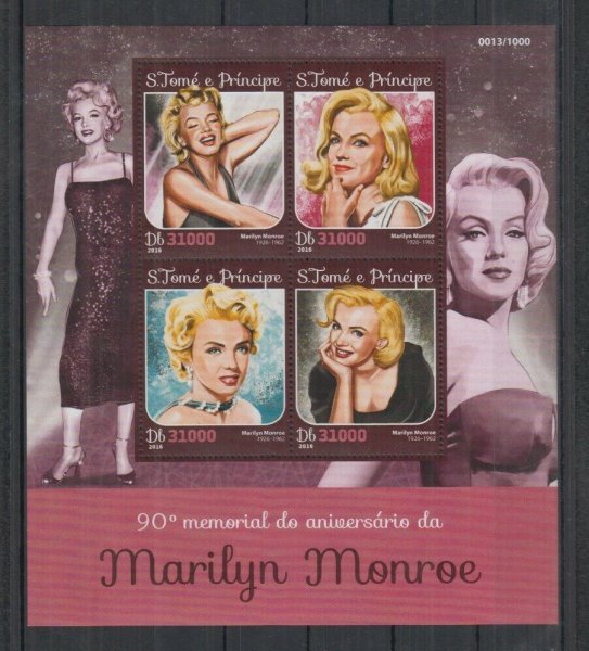 - サントメプリンシペ切手『マリリン・モンロー生誕90周年』4枚大シート 2016