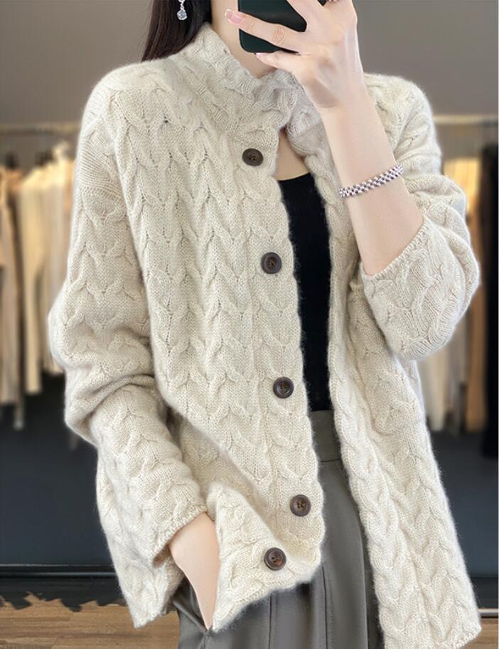 - 秋冬美品*上質 ニットカーディガン 秋冬 ケーブル編み カシミヤ混 アウター オシャレ ニットコート 気質 大人* 浅キャメル