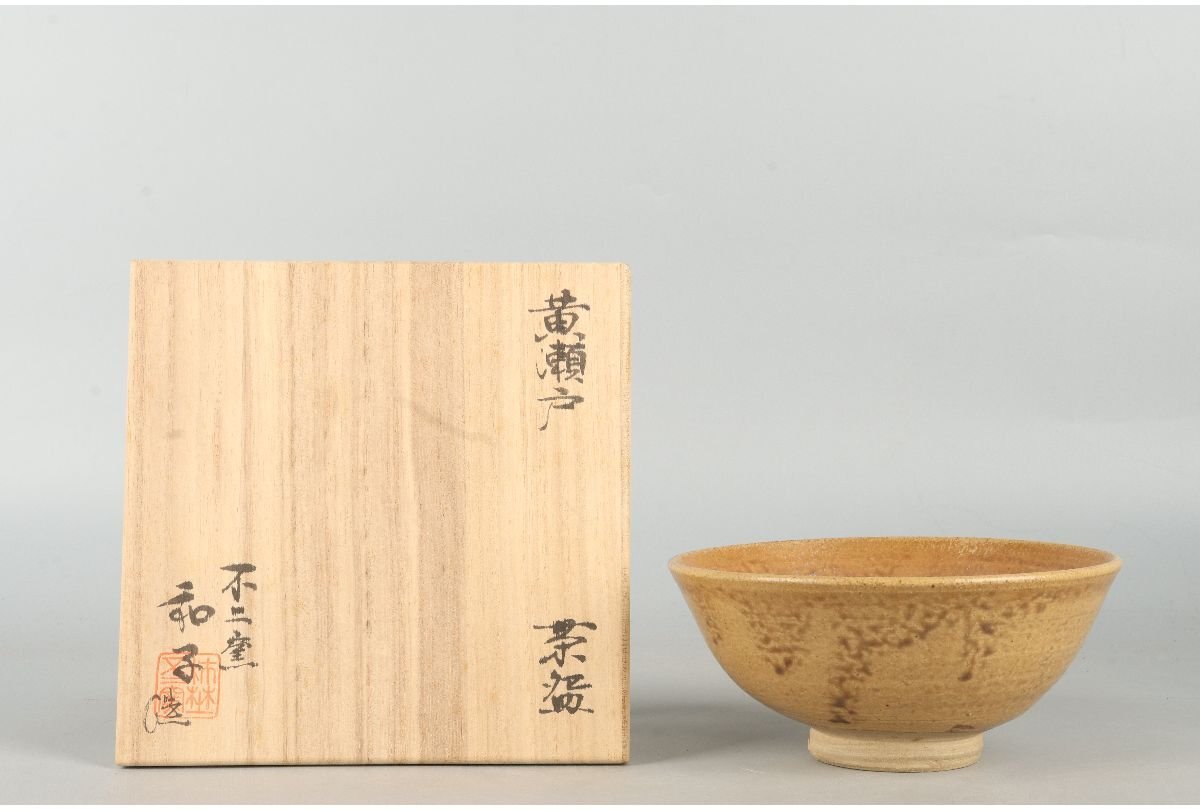 > [ギャラ藤]不二窯/佐藤和子 造/黄瀬戸茶碗/共箱/B-1522 (検索)骨董/織部焼/美濃焼/黄瀬戸/茶器/煎茶器/煎茶碗/茶道具