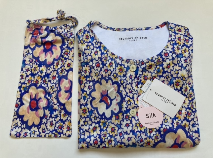 - ツモリチサト L ワンピース マーガレット シルクニット 絹100% 前開き 巾着 ポーチ付 ワコール パジャマ ガウン 花 キズあり