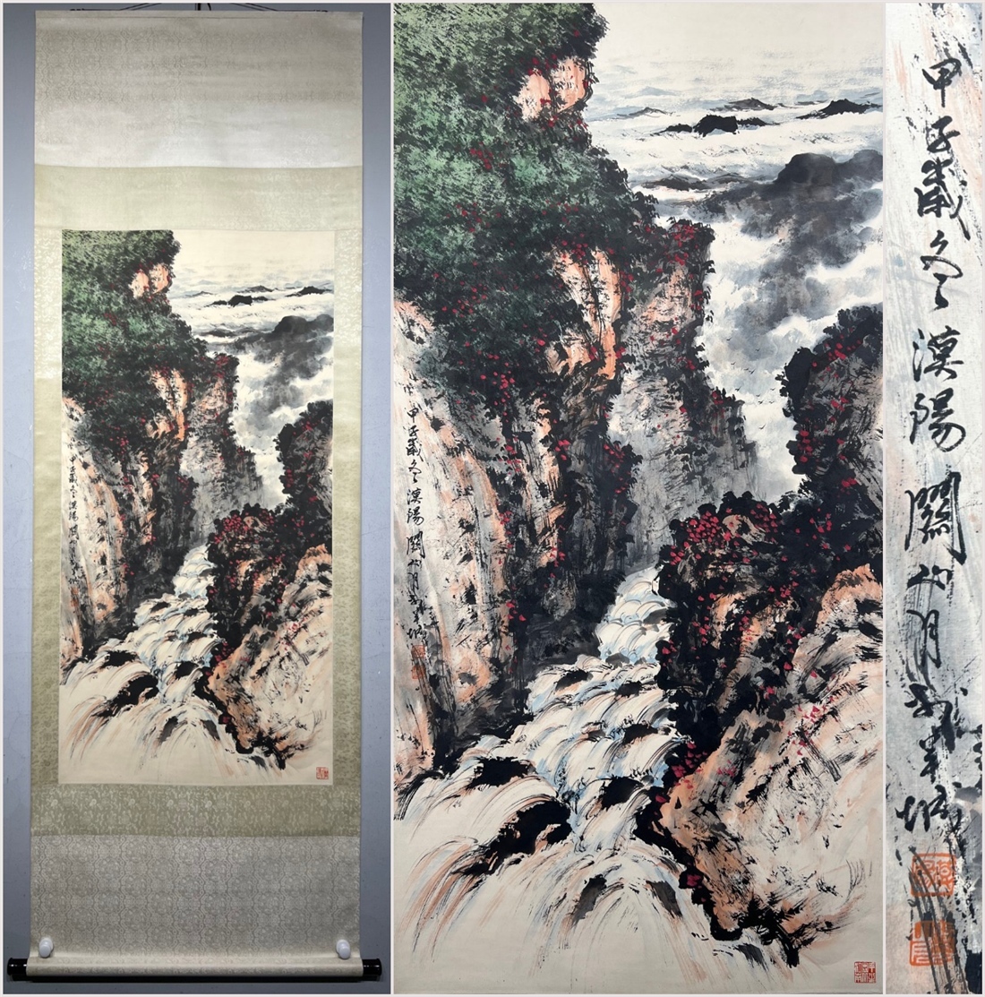 - 古美術 掛け軸 中国・近現代 「関山月書」 紙本 【観瀑図】 立軸 書道 巻き物 肉筆保証 唐物 古画 画心137×68cm LT-2410192