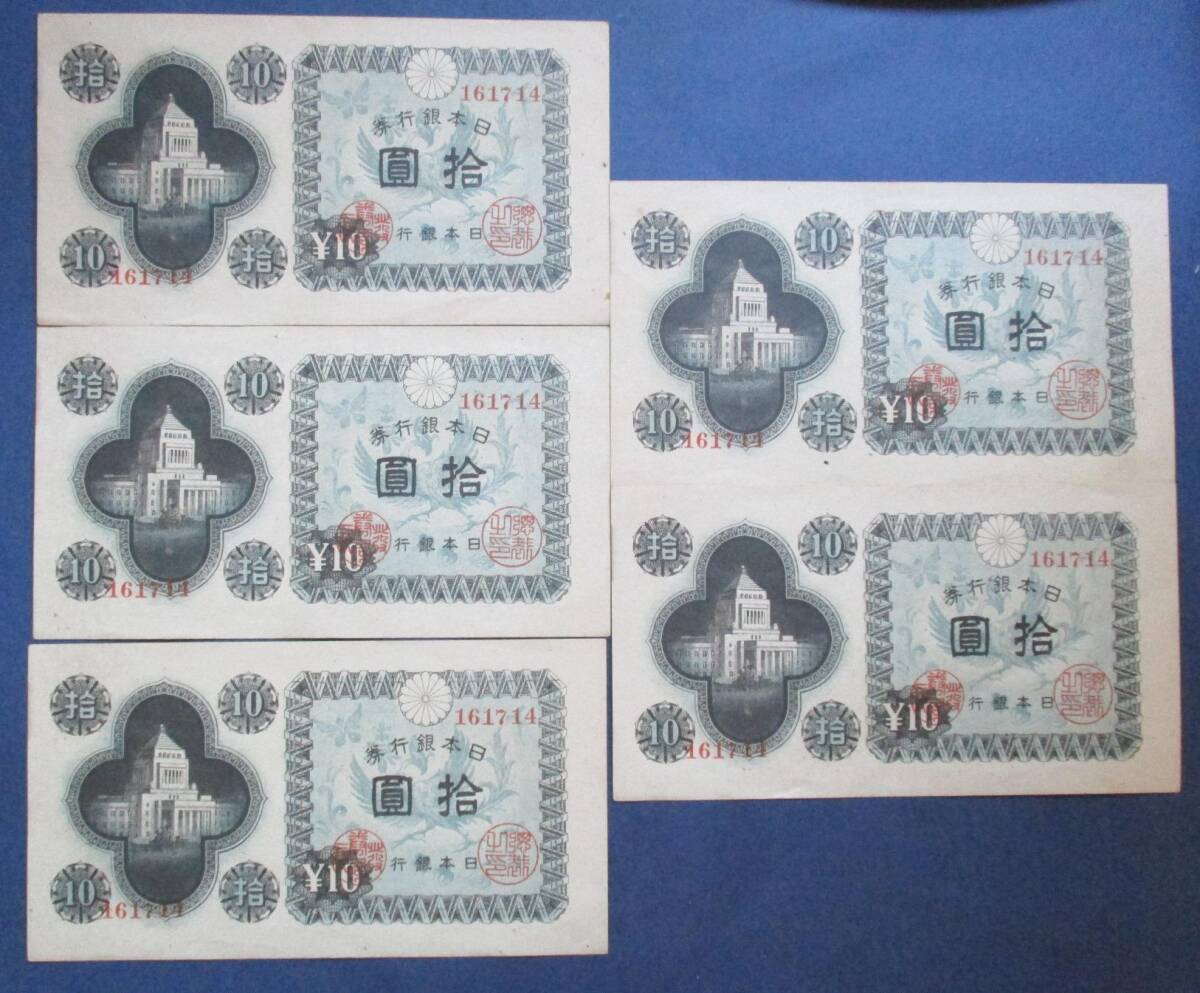 > 日本紙幣 日本銀行券A号10円 議事堂10円紙幣5セット 161714 SS123 未使用ピン札ですが、1枚しみがあります。 画像参照してください。