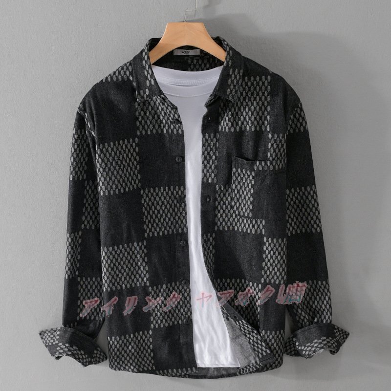 > ☆新品デニムシャツ 開襟長袖シャツ ウエスタンシャツ チェック柄 春秋冬服 ブルゾン メンズ トップス カジュアル 黒 XL