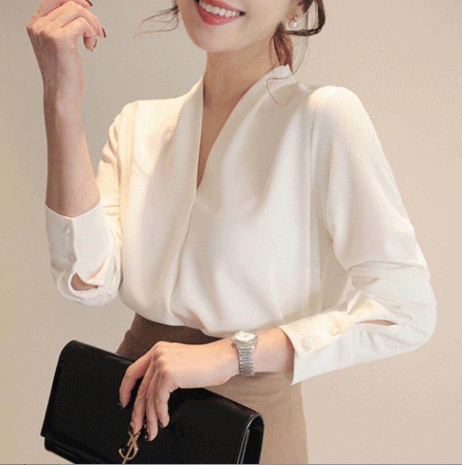 - 秋新作/ブラウス レディース シャツ 長袖 Vネック フォーマル シフォン トップス カジュアル 無地 普段着 オフィス 通勤 OL 制服 事務服/白