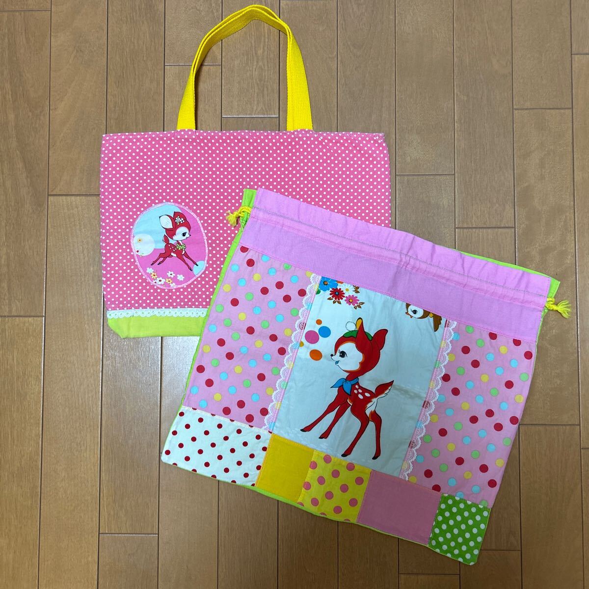 - ☆ハンドメイド昭和レトロバンビちゃんレッスンバッグ&大きめ巾着パッチワーク★