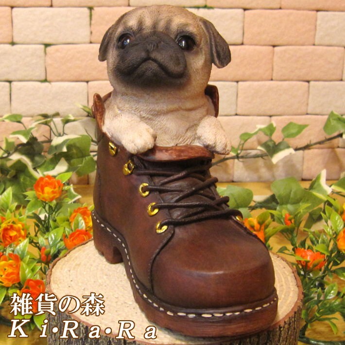 - 置物 動物 可愛い 犬の置物 パグ リアル シューズドッグ 革靴タイプ 子いぬのフィギュア イヌのオブジェ ガーデニング