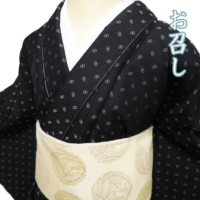> お召し 御召 着物 中古 正絹 袷 カジュアル 輪違い紋 黒色 身丈164cm 裄66cm L きもの北條 A1109-2