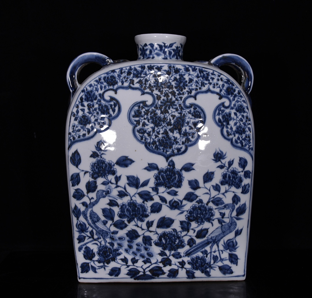 - ◆蔵出◆古美術 中国古玩 元時代 元青花 青花 纏枝蓮花紋 牡丹花卉 花鳥紋扁瓶 時代物 AT08