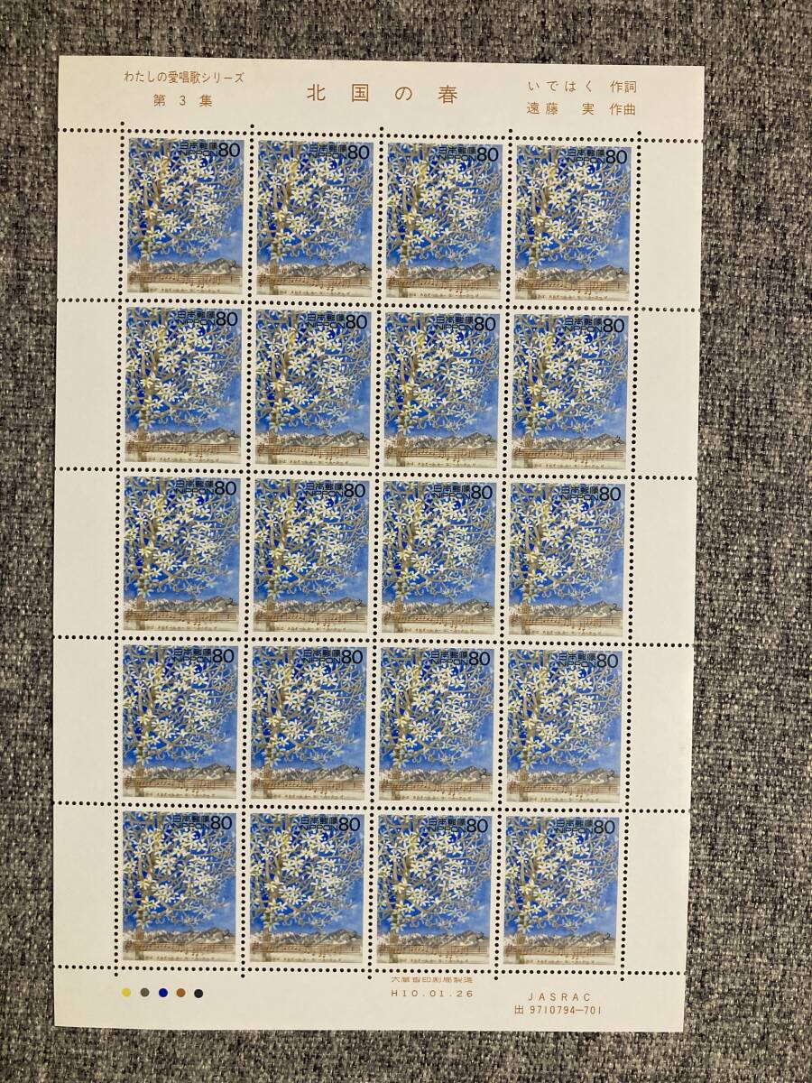- ★未使用 わたしの愛唱歌シリーズ 第3集 北国の春 千昌夫 作詞 いではく 作曲 遠藤実 原画 堀文子 1998年 平成10年 切手シート 80円 20枚