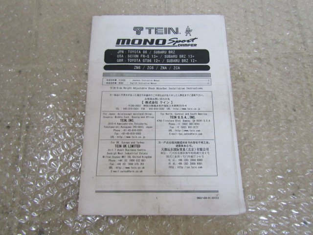 - TEIN テイン MONO Sport DAMPER / トヨタ 86 スバル BRZ 取扱説明書