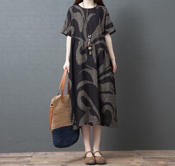 - 2021 夏 ゆったり 素敵な プリント 綿麻 大きいサイズ 半袖 カジュアル 可愛い大人 ロングワンピースYWQ424