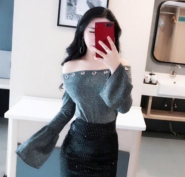 > ブラウス 長袖 M グレー オフショルダー ベルスリーブ ラメ トップス アイレット ハトメ シルバー 新品 YLH219