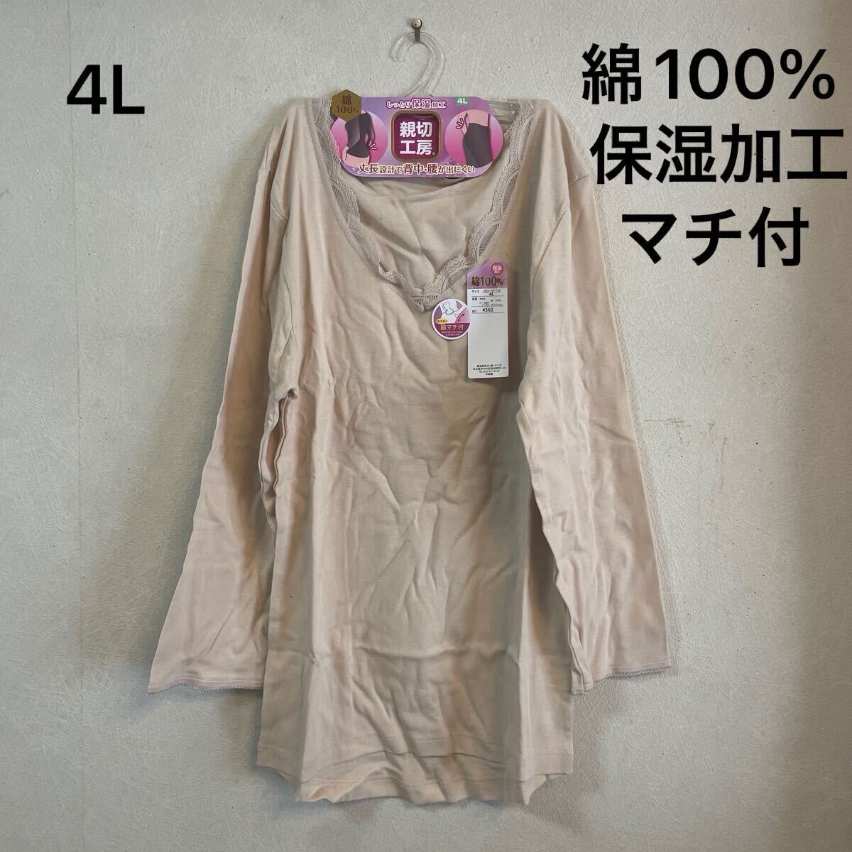 - 婦人 肌着 レディース インナー 長袖 シャツ レース付 4L 綿100% フライス編み 保湿加工 脇マチ付 後身長め モカ 女性用